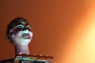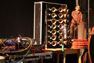 Next, Sarah Angliss took to the stage, flanked by Wolfgang and Hugo, a pair of deeply eerie automatons. The heat of the evening added a fever-dream element to the surreal proceedings, Angliss fearing that we were “almost at the melting point of plastic”, which seemed to correspond with the melting point of my brain. Her set was a miniature chamber-orchestra of bells, smeared voices, bowed saw, keyboard, and whirring ventriloquist head. Fundamentally strange but enticingly so, like an inviting haunted house, Angliss presided over a series of sound pieces and subtle torch songs that included some wonderful moments. Among them were: Wolfgang thumping drum pads, his “little heartbeat dispossed” over a mossy pot of rotting loops, decayed melody and human panting; a flexing, breathing handbag at the side of the stage, expanding and contracting in troubling unision with the music; a duet with sister, Jenny, her partner in Spacedog, for a song about the Lankin, a baby snatching mythical intruder: the sound of a squelching infant gargle, effortlessly disturbing and throught provoking. My favourite part of the evening was a nautical love song with beautiful lyrics, addressed to a submariner , “I’ll lick the minerals from your skin, if you’ll lay upon this bed of mine”; the music encompassed washes of tide, sonar pings, and aquatic distortion; a magical, captivating electro-ballad.