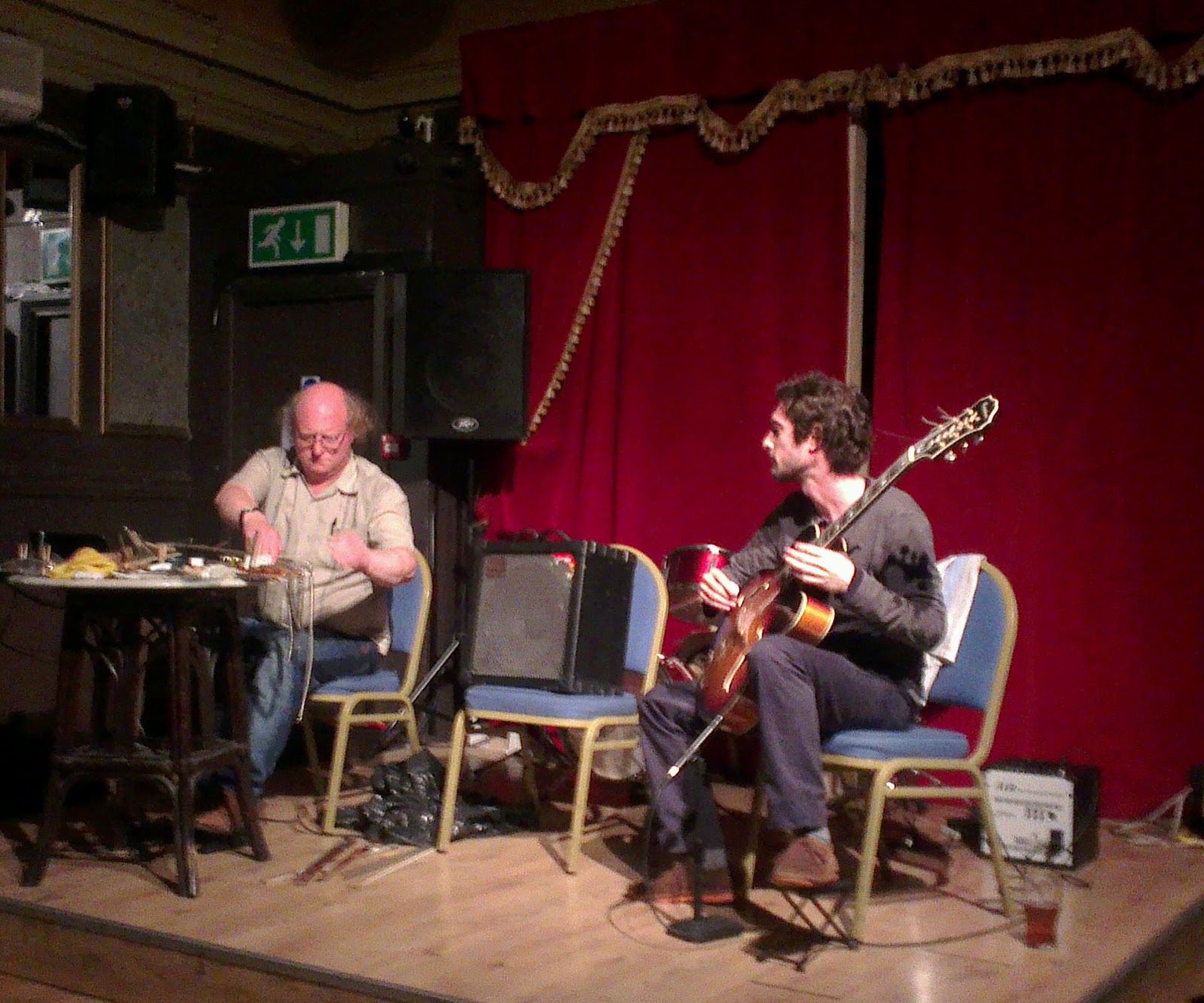 The third act of the evening was a pairing of Adam Bohman (amplified objects) and Daniel Thompson (guitar). This group was an interesting pairing of controlled chaos from Bohman and weaving bracketing lines from Thompson. The guitarist was a spidery presence, dropping a sound-web over Bohman’s grinding morass of rubbery industrial racket; flicking delicate glassy notes into a churning cement mixer. Thompson employed an almost anti-shred technique, completely without excess, holding back and acting as a contrast to Bohman’s rumbling abandon. The duo were the living embodiment of the neighbour in Tom Waits’ ‘What’s He Building?’