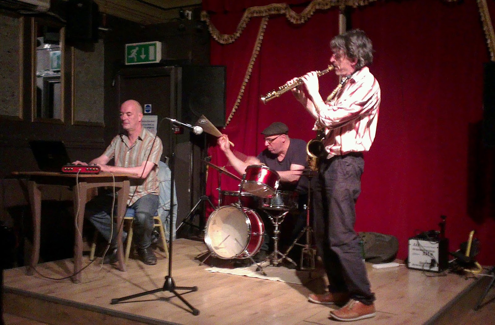 The night’s final group was an ensemble of Dave Tucker (synth), Phil Marks (drums), and Adrian Northover (saxes). They instantly created a great dynamic; Tucker and Marks conjuring a caustic sound-froth beneath Northover’s sharp sax flurries. Marks’ sticks often flailed the air, creating inaudible beats around the actual ones. Tucker’s contribution was a liquid amorphous gloop, flowing around the others like noise grouting. Northover’s playing incorporated sustained tones, long looping runs, and breathe-stretching quacking tongue flutters. Tucker at one point named the band ‘Wet Nightmare’; a more apt moniker would be impossible to think of.