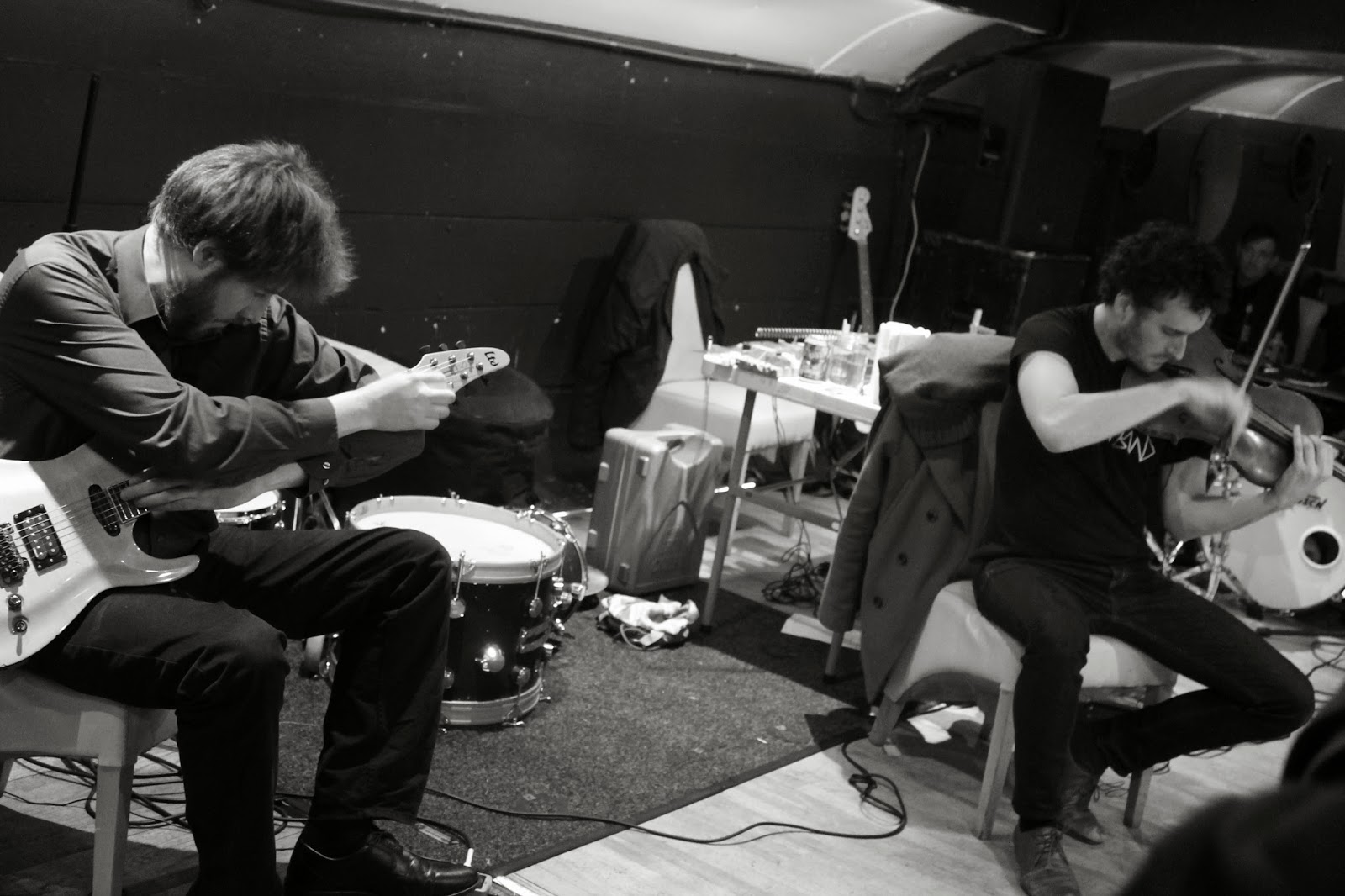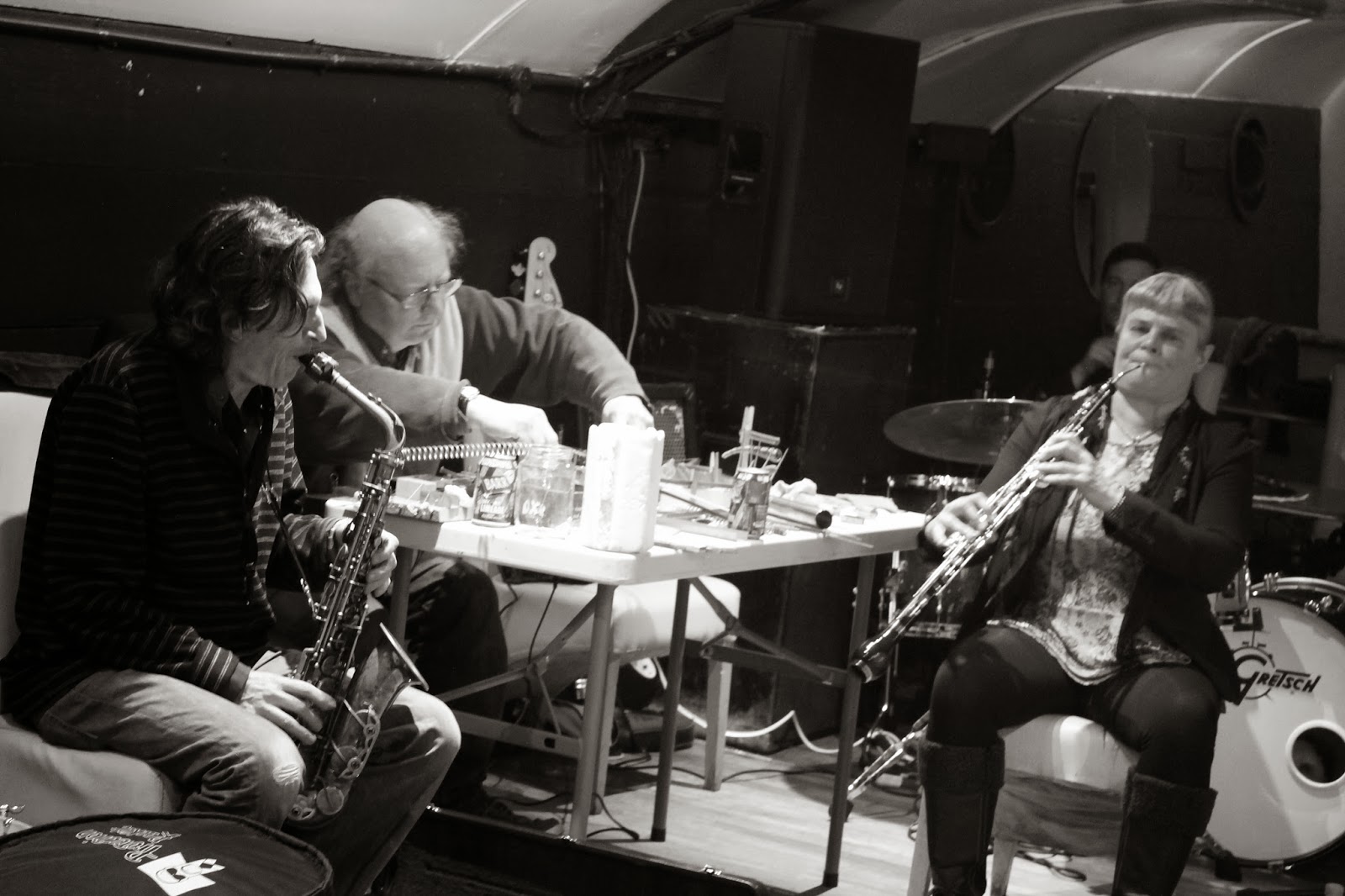 Adam Bohman (amplified objects), Adrian Northover (saxophone), and Catherine Pluygers (oboe) were the next group. They began with the trading of small discrete gestures with gulfs of silence between, the gaps filled with the hum of the bar fridges: a complementary hissing drone. Their separate compartments of sound came together in a dance of trembling delicacy. Catherine Pluygers’ melodies were like a frayed ‘La Mer’ with the occasional intruding siren honk. Adam Bohman throughout transmitted a garbled alien process, packed with crackle. The set resembled a nest being built; twigs added sparingly but precisely, long considered thought employed before every flutter and scrape. This method amounted to a considered intensity, built from careful but teetering construction, sudden windows opening onto whispering plains. The trio played a fiercer second act; Bohman’s oddly vocal jumble-sale of sound whipped up some great noise: ape cries, human moans, dog whimpers. The buzz and burr of Pluygers and Northover saw them engaging and splitting apart into arcing solos.