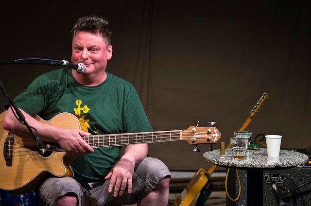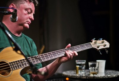 Howie Reeve was an avuncular presence, opening with a joke about the Uncle Bonmee ghost-audience caused by the glare of spots–lights in his eyes. His character seemed as fluid, warm and engaging as his wonderful music, playing acoustic-bass avant-folk infused with traces of Minutemen and Slint. A river of humour ran through the set: a song with an intro “a bit like Cool for Cats”; lyrics about people playing “arpeggios with their willies”, and the beautiful line “your heart is like a sack of drowned puppies.” This was music meandering and generous with its audience, open and bright, he mused that we must be accustomed to a higher instrumental proficiency at the Café Oto; certainly not a more shining imagination. One highlight was a moment where the audience were invited to make a low guttural croak during a song about high scoring Scrabble tactics and living vivaciously. There was an abundance of heart and soul in every string reverberation, revealing and illuminative, deviously circuitous. Howie Reeve is on to something here, fuck knows what it is but you should allow him to lead you off Aguirre-style, adorned with monkeys, eyes brimming with whisky-soaked genius and lunacy.