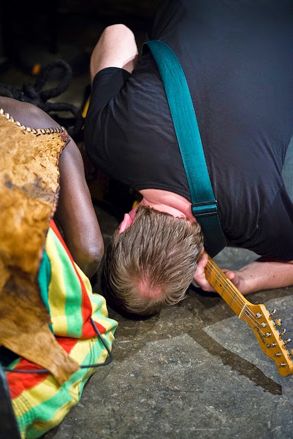 Zea is the solo alias of Arnold de Boers, vocalist in The Ex; using a minimal set-up of guitar and sampler, he created a maximal one-man polemical punk funk pop juggernaut. Mechanistic but ramshackle with it, he deployed wobbling bass electronics, dub and scabrous guitar scrapings; the solemn but excitable lyrics evocative of prime Guy Picciotto confronto-barking. There was sharp electro-punk poetry “taken to a field where donkeys grow” shouted with heart-lifting anger. Zea fills the veins and lights-up brains without neglecting to move your feet. He was joined by King Ayisoba for a rousing and thrilling rendition of Leadbelly’s ‘Bourgeois Blues’.