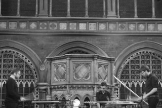 Missing much of Mook and Papernut Cambridge, I arrived in time for the band that most strongly drew me to this session of Daylight Music at the Union Chapel. Ex-Easter Island Head began in an almost ritual manner, an invocation of sorts; four guitars laid upon tables, struck with mallets and resounding, appropriately given the venue, like great electric church bells. A complicated rhythm was conjured: cow bells and drums, beats, chimes and klangs entwined in an ever-thickening spiral; spinning and sucking, the undertow of repetition becoming hypnotic; loops within loops within loops; all human-derived and played. This was machine-like in process but full of hand-crafted brain-sculpted beauty; a half-hour of magic. A mid-section saw all three band members rubbing the guitar strings into shivering choirs of undulating noise. The final third built to a thrilling motoric coda; the sudden end felt wrenching and cruel; the cheers that immediately filled the venue were not, the band appearing moved by the long and grateful applause. The show was performed with light pouring down upon the pews; the band adding further illumination in the minds of those observing their unforgettable performance.